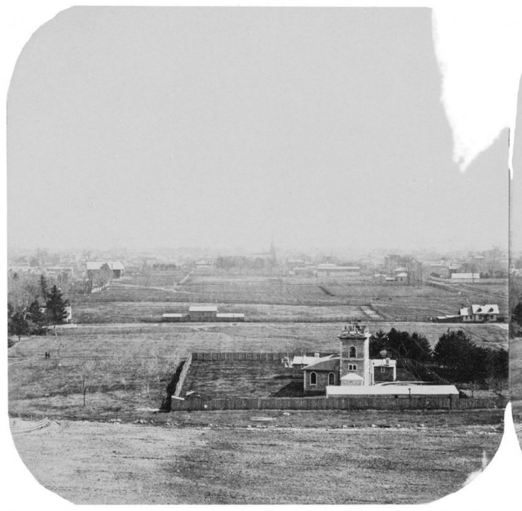 Far exceeding its original three-year plan, by the beginning of the 1850s, the British-led project was winding down. Determined to retain the observatory and its scientific work in Toronto, Lefroy lobbied the Canadian government to take on the facility. In 1853–with a small interruption–the magnetic observatory’s operations were transferred to the Province of Canada, and the now aging earth-and-wood cabin rebuilt as a small stone building.9 A photograph of around 1857, taken from the still relatively new tower of the main, and sole, University of Toronto building (now University College) shows the 1854 observatory still surrounded by open fields.